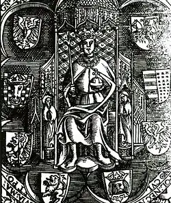 He was baptised on 21 December 1427 and was named after his deceased brother.[7] Stanisław Ciołek, Bishop of Poznań, or Nicholas of Radom composed a panegyric contrafactum titled Hystorigraphi aciem in honour of his birth which was sung at the christening ceremony.[8] In his early years, Casimir was nursed by his mother and supervised by vice-chancellor Wincenty Kot, the future Archbishop of Gniezno and Primate of Poland, as well as by a knight named Piotr of Rytro. Casimir often relied on his instinct and feelings and had little political knowledge, but shared a great interest in the diplomacy and economic affairs of the country. After the accession of his brother, Władysław III, to the throne of Poland, the tutelage was assigned to Cardinal Zbigniew Oleśnicki, however, the cleric neglected his duties as he felt a strong reluctance towards Casimir, believing that he would be an unsuccessful monarch following Władysław's death.[9]