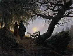 Bare oak trees and tree stumps, such as those in Raven Tree (c. 1822), Man and Woman Contemplating the Moon (c. 1824), and Willow Bush under a Setting Sun (c. 1835), are recurring elements of his paintings, and usually symbolise death.[57] Countering the sense of despair are Friedrich's symbols for redemption: the cross and the clearing sky promise eternal life, and the slender moon suggests hope and the growing closeness of Christ.[55] In his paintings of the sea, anchors often appear on the shore, also indicating a spiritual hope.[58] In The Abbey in the Oakwood, the movement of the monks away from the open grave and toward the cross and the horizon imparts Friedrich's message that the final destination of man's life lies beyond the grave.[59]