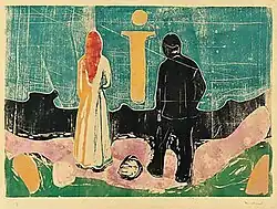 At the turn of the 20th century, Friedrich was rediscovered by the Norwegian art historian Andreas Aubert (1851–1913), whose writing initiated modern Friedrich scholarship,[16] and by the Symbolist painters, who valued his visionary and allegorical landscapes. The Norwegian Symbolist Edvard Munch (1863–1944) would have seen Friedrich's work during a visit to Berlin in the 1880s. Munch's 1899 print The Lonely Ones echoes Friedrich's Rückenfigur (back figure), although in Munch's work the focus has shifted away from the broad landscape and toward the sense of dislocation between the two melancholy figures in the foreground.[70]