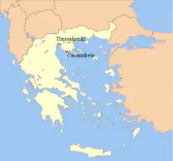 A son of Antipater and a contemporary of Alexander the Great, Cassander was one of the Diadochi who warred over Alexander's empire following the latter's death in 323 BC. Cassander later seized power by having Alexander's son and heir Alexander IV murdered.[4] While governing Macedonia from 317 BC until 297 BC, Cassander focused on strengthening the northern borders and economic development, while founding or restoring several cities (including Thessalonica, Cassandreia, and Thebes); however, his ruthlessness in dealing with political enemies complicates assessments of his rule.[5][6][7]