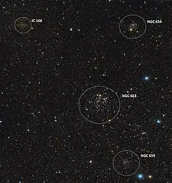 The other prominent open clusters in Cassiopeia are NGC 457 and NGC 663, both of which have about 80 stars. NGC 457 is looser, and its brightest member is Phi Cassiopeiae, a white-hued supergiant star of magnitude 5.0. However, it is uncertain whether Phi Cassiopeiae is part of the open cluster or not.[40] The stars of NGC 457, arrayed in chains, are approximately 10,000 light-years from Earth. NGC 663 is both closer, at 8200 light-years from Earth, and larger, at 0.25 degrees in diameter.[24]