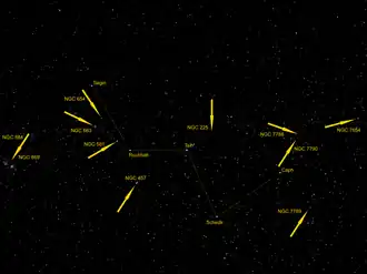| Brightest star | α Cas (Schedar)[a] (2.24m) |