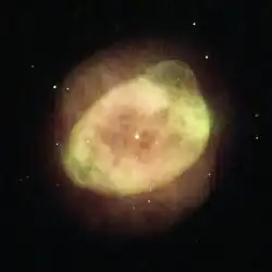 Rho Cassiopeiae is a semi-regular pulsating variable yellow hypergiant, and is among the most luminous stars in the galaxy at approximately 500,000 L☉.[33] It has a minimum magnitude of 6.2 and a maximum magnitude of 4.1; its period is approximately 320 days. It has around 450 times the Sun's diameter and 17 times its mass, having begun life 45 times as massive as the Sun. Rho Cassiopeiae is about 10,000 light-years from Earth. Cassiopeia includes V509 Cassiopeiae, a second example of the extremely rare yellow hypergiants, which is around 400,000 times as luminous as the Sun and 14 times as massive,[33] as well as 6 Cassiopeiae which is a hotter white hypergiant. It also hosts the red supergiant PZ Cassiopeiae, which is one of the largest known stars with an estimate of 1,190–1,940 R☉ and is also a semiregular variable.[34] Between 240,000 and 270,000 times as luminous as the Sun, it is around 9,160 light-years distant from Earth.[35]