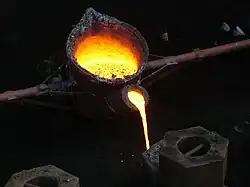 Casting is a manufacturing process in which a liquid material is usually poured into a mold, which contains a hollow cavity of the desired shape, and then allowed to solidify. The solidified part is also known as a casting, which is ejected or broken out of the mold to complete the process. Casting materials are usually metals or various time setting materials that cure after mixing two or more components together; examples are epoxy, concrete, plaster and clay. Casting is most often used for making complex shapes that would be otherwise difficult or uneconomical to make by other methods. Heavy equipment like machine tool beds, ships' propellers, etc. can be cast easily in the required size, rather than fabricating by joining several small pieces.[1] Casting is a 7,000-year-old process. The oldest surviving casting is a copper frog from 3200 BC.[2]