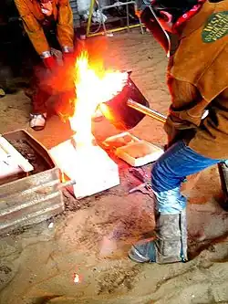 Raw castings often contain irregularities caused by seams and imperfections in the molds,[10] as well as access ports for pouring material into the molds.[11] The process of cutting, grinding, shaving or sanding away these unwanted bits is called "fettling" in British English.[12][13] In modern times robotic processes have been developed to perform some of the more repetitive parts of the fettling process,[14] but historically fettlers carried out this arduous work manually,[5] and often in conditions dangerous to their health.[15] Fettling can add significantly to the cost of the resulting product, and designers of molds seek to minimize it through the shape of the mold, the material being cast, and sometimes by including decorative elements.[16][10]