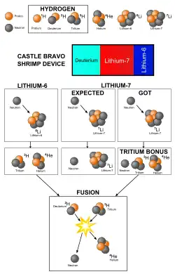 The yield of 15 (± 5) Mt[32] was triple that of the 5 Mt predicted by its designers.[3][23]: 541 The cause of the higher yield was an error made by designers of the device at Los Alamos National Laboratory. They considered only the lithium-6 isotope in the lithium deuteride secondary to be reactive; the lithium-7 isotope, accounting for 60% of the lithium content, was assumed to participate in reactions that were too slow to contribute to the yield.[23]: 541 It was correctly expected that the lithium-6 isotope would absorb a neutron from the fissioning plutonium and emit an alpha particle and tritium in the process, of which the latter would then fuse with the deuterium and increase the yield in a predicted manner.