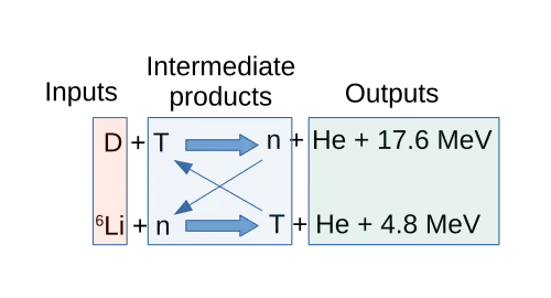 The Jetter cycle is a combination of reactions involving lithium, deuterium, and tritium. It consumes lithium-6 and deuterium, and in two reactions (with energies of 17.6 MeV and 4.8 MeV, mediated by a neutron and tritium) it produces two alpha particles.[14]
