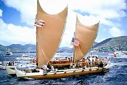 Roland and Francis Prout experimented with catamarans in 1949 and converted their 1935 boat factory in Canvey Island, Essex (England), to catamaran production in 1954. Their Shearwater catamarans easily won races against monohulls. Yellow Bird, a 1956-built Shearwater III, raced successfully by Francis Prout in the 1960s, is in the collection of the National Maritime Museum Cornwall.[22] Prout Catamarans, Ltd. designed a mast aft rig with the mast aft of midships to support an enlarged jib—more than twice the size of the design's reduced mainsail; it was produced as the Snowgoose model.[23] The claimed advantage of this sail plan was to diminish any tendency for the bows of the vessel to dig in.[24][25]