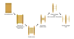 Two canoes bound together developed directly from minimal raft technologies of two logs tied together. Over time, the twin-hulled canoe form developed into the asymmetric double canoe, where one hull is smaller than the other. Eventually the smaller hull became the prototype outrigger, giving way to the single outrigger canoe, then to the reversible single outrigger canoe. Finally, the single outrigger types developed into the double outrigger canoe (or trimarans).[5][6][1]