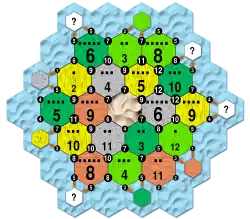 The players in the game represent settlers establishing settlements on the fictional island of Catan. Players build settlements, cities, and roads to connect them as they settle the island.[10] The game board, which represents the island, is composed of hexagonal tiles (hexes) of different land types, which are laid out randomly at the beginning of each game.[11] Newer editions of the game began to depict a fixed layout in their manual and recommend this to be used by beginners. In 2016, editions of the game were released with a conventional fixed layout board in this configuration, the hexes of which cannot be rearranged.