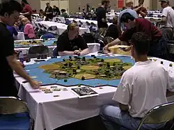 A giant game of Catan being played at Gen Con Indy 2003. This is one of many custom, extra-large Catan boards seen during demonstrations and tournaments at Gen Con.