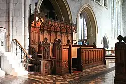The fourth dignitary is the treasurer (custo, sacrisla, cheficier) who is guardian of the fabric, and of all the furniture and ornaments of the church, and whose duty was to provide bread and wine for the Eucharist, and candles and incense. The treasurer also regulated such matters as the ringing of the bells. The treasurer's stall is opposite to that of the chancellor.