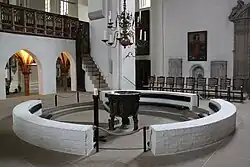 Cathedrals always have a font or water basin at which the rite of baptism is performed, in which a person is formally accepted into the Christian church. The font is often placed towards the door because the Baptism signifies entry into the community of the church. In some cathedrals, most particularly in Italy, the rite of baptism is performed in a separate building. One of the functions of the cathedral is the reading and expounding upon the Holy Scripture. The cathedral generally has a lectern from which the scripture is read. This often takes the form of an eagle of brass or carved wood which supports the book on its outstretched wings and is the symbol of John the Evangelist. However, some cathedrals retain elaborate medieval structures on either side of the church, one for the reading of the Gospel and the other for the reading of the Epistle.