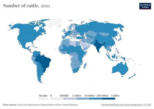 Cattle have the largest biomass of any animal species on Earth, at roughly 400 million tonnes, followed closely by Antarctic krill at 379 million tonnes and humans at 373 million tonnes.[96] In 2023, the countries with the most cattle were India with 307.5 million (32.6% of the total), Brazil with 194.4 million, and China with 101.5 million, out of a total of 942.6 million in the world.[97]