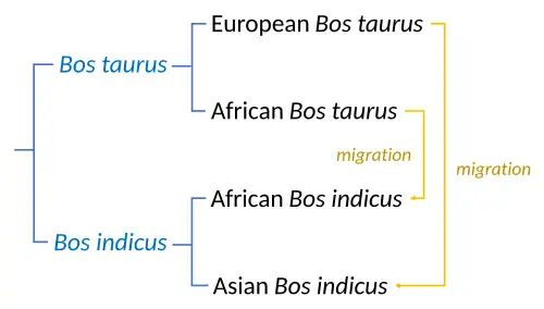 Cattle phylogeny and migrations involve two major species, at least two domestications, and migrations between these.[73]