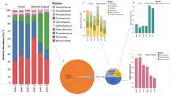 Bacteria dominate the rumen microbiome; composition can change substantially with diet.[12]