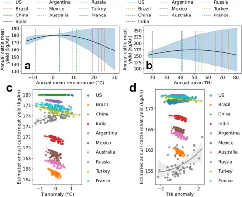 122. ^ a b Liu, Weihang; Zhou, Junxiong; Ma, Yuchi; Chen, Shuo; Luo, Yuchuan (3 February 2024). "Unequal impact of climate warming on meat yields of global cattle farming". Communications Earth and Environment. 5 (1): 65. Bibcode:2024ComEE...5...65L. doi:10.1038/s43247-024-01232-x.