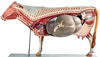 The gestation period for a cow is about nine months long. The ratio of male to female offspring at birth is approximately 52:48.[15] A cow's udder has two pairs of mammary glands or teats.[16] Farms often use artificial insemination, the artificial deposition of semen in the female's genital tract; this allows farmers to choose from a wide range of bulls to breed their cattle. Estrus too may be artificially induced to facilitate the process.[17] Copulation lasts several seconds and consists of a single pelvic thrust.[18]