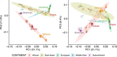 Genomic analysis shows there are five main cattle sub-types, here labelled by continent.[63]