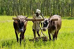 Oxen are cattle trained as draft animals. Oxen can pull heavier loads and for a longer period of time than horses.[110] Oxen are used worldwide, especially in developing countries. There are some 11 million draft oxen in sub-Saharan Africa,[111] while in 1998 India had over 65 million oxen.[112] At the start of the 21st century, about half the world's crop production depended on land preparation by draft animals.[113]