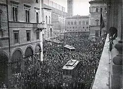 Mussolini used his new newspaper Il Popolo d'Italia and his strong oratorical skills to urge a broad political audience – ranging from right-wing nationalists to patriotic revolutionary leftists – to support Italy's entry into the war to gain back Italian-populated territories from Austria-Hungary, by saying "enough of Libya, and on to Trento and Trieste".[79] Although the left was traditionally opposed to war, Mussolini claimed that this time it was in their interest to join the war to tear down the aristocratic Hohenzollern dynasty of Germany which he claimed was the enemy of all European workers.[80] Mussolini and other nationalists warned the Italian government that Italy must join the war or face revolution and called for violence against pacifists and neutralists.[81]