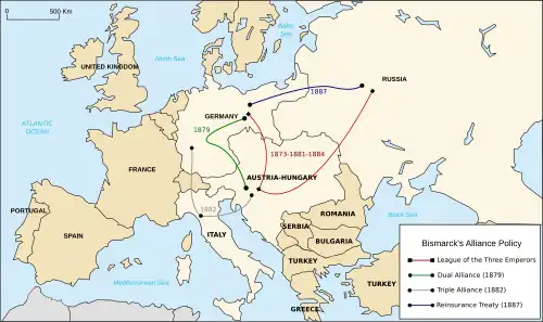 In 1887, German and Russian alignment was secured by means of a secret Reinsurance Treaty arranged by Otto von Bismarck. However, in 1890, Bismarck fell from power, and the treaty was allowed to lapse in favor of the Dual Alliance (1879) between Germany and Austria-Hungary. That development was attributed to Count Leo von Caprivi, the Prussian general who replaced Bismarck as chancellor. It is claimed that Caprivi recognized a personal inability to manage the European system as his predecessor had and so was counseled by contemporary figures such as Friedrich von Holstein to follow a more logical approach, as opposed to Bismarck's complex and even duplicitous strategy.[16] Thus, the treaty with Austria-Hungary was concluded despite the Russian willingness to amend the Reinsurance Treaty and to sacrifice a provision referred to as the "very secret additions"[16] that concerned the Turkish Straits.[17]