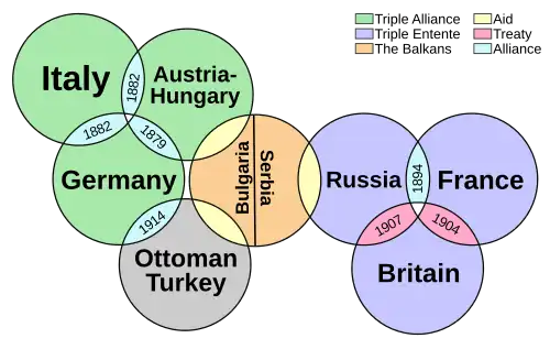 Other scholars, most notably Niall Ferguson, argue that Britain chose France and Russia over Germany because Germany was too weak an ally to provide an effective counterbalance to the other powers and could not provide Britain with the imperial security that was achieved by the Entente agreements.[32] In the words of the British diplomat Arthur Nicolson, it was "far more disadvantageous to us to have an unfriendly France and Russia than an unfriendly Germany."[33] Ferguson argues that the British government rejected German alliance overtures "not because Germany began to pose a threat to Britain, but, on the contrary because they realized she did not pose a threat."[34] The impact of the Triple Entente was therefore twofold by improving British relations with France and its ally, Russia, and showing the importance to Britain of good relations with Germany. It was "not that antagonism toward Germany caused its isolation, but rather that the new system itself channeled and intensified hostility towards the German Empire."[35]