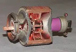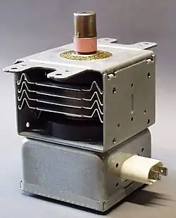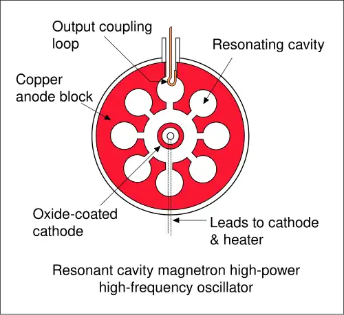 The cavity magnetron[1] is a high-power vacuum tube used in early radar systems and subsequently in microwave ovens and in linear particle accelerators. A cavity magnetron generates microwaves using the interaction of a stream of electrons with a magnetic field, while moving past a series of cavity resonators, which are small, open cavities in a metal block. Electrons pass by the cavities and cause microwaves to oscillate within, similar to the functioning of a whistle producing a tone when excited by an air stream blown past its opening. The resonant frequency of the arrangement is determined by the cavities' physical dimensions. Unlike other vacuum tubes, such as a klystron or a traveling-wave tube (TWT), the magnetron cannot function as an amplifier for increasing the intensity of an applied microwave signal; the magnetron serves solely as an electronic oscillator generating a microwave signal from direct-current electricity supplied to the vacuum tube.