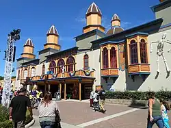 After Slackford became ill in 1888, Dwelle entered into a more lucrative partnership with Adam Stoll and Louis Adolph, who owned land at Cedar Point, along with investors Charles Baetz and Jacob Kuebeler.[15] The partnership's first venture was constructing a Grand Pavilion, which opened the same year in 1888 and marked the first concerted effort to operate the peninsula as a public resort.[16] It was a two-story theater and concert hall with a bowling alley and photographer's studio. The building was recognized for its unusual architecture and still stands in the park.[15] The first amusement ride at Cedar Point, a water toboggan ride consisting of a ramp that launched riders into Lake Erie, opened in 1890. Electricity was installed at Cedar Point in 1891.[17] The first roller coaster, Switchback Railway, opened the following year. It stood 25 feet (7.6 m) high and had a top speed of 10 miles per hour (16 km/h). The Switchback Railway was designed as two identical tracks side-by-side – one for the ride down and the other for the train to be hauled back to the top by the ride attendant.[9]