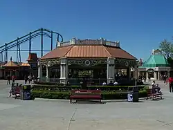 Cedar Point is a 364-acre (147 ha) amusement park located on a Lake Erie peninsula in Sandusky, Ohio, United States, owned and operated by Six Flags. It opened in 1870 and is considered the second-oldest operating amusement park in the US behind Lake Compounce.[3] Prior to the merger with Six Flags in 2024, Cedar Point served as the "flagship park" of the Cedar Fair amusement park chain and hosted the corporate headquarters.[4] Known as "America's Roller Coast",[5] the park features 18 roller coasters, which ranks second among amusement parks in North America behind sister park Six Flags Magic Mountain and Canada's Wonderland, each with 19.