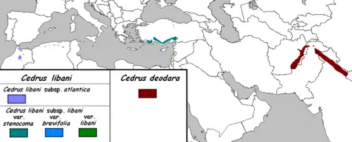 - ^ Dagher-Kharrat, M. B.; et al. (2007). "Geographical diversity and genetic relationships among Cedrus species estimated by AFLP" (PDF). Tree Genetics & Genomes. 3 (3): 275–285. doi:10.1007/s11295-006-0065-x.