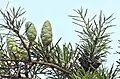 The shoots are dimorphic, made up of long thin leading shoots from terminal buds, each one accompanied by multiple short lateral shoots.[7] The leaves are evergreen and needle-like, 8–60 millimetres (1⁄4–2+1⁄4 in) long, arranged in an open spiral phyllotaxis on long shoots and in dense spiral clusters of 15–45 together on short shoots; they vary from bright grass-green to dark green to strongly glaucous pale blue-green, depending on the thickness of the white wax layer which protects the leaves from drying out.[6]