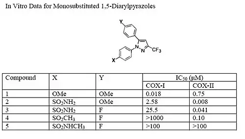 39. ^ a b c Penning TD, Talley JJ, Bertenshaw SR, Carter JS, Collins PW, Docter S, et al. (April 1997). "Synthesis and biological evaluation of the 1,5-diarylpyrazole class of cyclooxygenase-2 inhibitors: identification of 4-[5-(4-methylphenyl)-3-(trifluoromethyl)-1H-pyrazol-1-yl]benze nesulfonamide (SC-58635, celecoxib)". Journal of Medicinal Chemistry. 40 (9): 1347–65. doi:10.1021/jm960803q. PMID 9135032.
