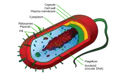 Cell-surface appendages can include flagella, and pili, protein structures that facilitate movement and communication between cells.[34] The flagellum stretches from the cytoplasm through the cell membrane and extrudes through the cell wall.[35] Fimbriae are short attachment pili, the other type of pilus is the longer conjugative type.[36] Fimbriae are formed of an antigenic protein called pilin, and are responsible for the attachment of bacteria to specific receptors on host cells.[37]