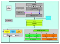 The PPE[32][33][34] is the PowerPC based, dual-issue in-order two-way simultaneous-multithreaded CPU core with a 23-stage pipeline acting as the controller for the eight SPEs, which handle most of the computational workload. PPE has limited out-of-order execution capabilities; it can perform loads out of order and has delayed execution pipelines. The PPE will work with conventional operating systems due to its similarity to other 64-bit PowerPC processors, while the SPEs are designed for vectorized floating point code execution. The PPE contains a 32 KiB level 1 instruction cache, a 32 KiB level 1 data cache, and a 512 KiB level 2 cache. The size of a cache line is 128 bytes in all caches.[27]: 136–137, 141  Additionally, IBM has included an AltiVec (VMX) unit[35] which is fully pipelined for single precision floating point (Altivec 1 does not support double precision floating-point vectors.), 32-bit Fixed Point Unit (FXU) with 64-bit register file per thread, Load and Store Unit (LSU), 64-bit Floating-Point Unit (FPU), Branch Unit (BRU) and Branch Execution Unit(BXU).[32] PPE consists of three main units: Instruction Unit (IU), Execution Unit (XU), and vector/scalar execution unit (VSU). IU contains L1 instruction cache, branch prediction hardware, instruction buffers, and dependency checking logic. XU contains integer execution units (FXU) and load-store unit (LSU). VSU contains all of the execution resources for FPU and VMX. Each PPE can complete two double-precision operations per clock cycle using a scalar fused-multiply-add instruction, which translates to 6.4 GFLOPS at 3.2 GHz; or eight single-precision operations per clock cycle with a vector fused-multiply-add instruction, which translates to 25.6 GFLOPS at 3.2 GHz.[36]