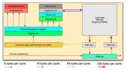 Each SPE is a dual issue, in-order processor composed of a "Synergistic Processing Unit",[39] SPU, and a "Memory Flow Controller", MFC (DMA, MMU, and bus interface). SPEs do not have any branch prediction hardware (hence there is a heavy burden on the compiler).[40] Each SPE has 6 execution units divided among odd and even pipelines on each SPE: The SPU runs a specially developed instruction set (ISA) with 128-bit SIMD organization[35][2][41] for single and double precision instructions. With the current generation of the Cell, each SPE contains a 256 KiB embedded SRAM for instruction and data, called "Local Storage" (not to be mistaken for "Local Memory" in Sony's documents that refer to the VRAM) which is visible to the PPE and can be addressed directly by software. Each SPE can support up to 4 GiB of local store memory. The local store does not operate like a conventional CPU cache since it is neither transparent to software nor does it contain hardware structures that predict which data to load. The SPEs contain a 128-bit, 128-entry register file and measures 14.5 mm2 on a 90 nm process. An SPE can operate on sixteen 8-bit integers, eight 16-bit integers, four 32-bit integers, or four single-precision floating-point numbers in a single clock cycle, as well as a memory operation. Note that the SPU cannot directly access system memory; the 64-bit virtual memory addresses formed by the SPU must be passed from the SPU to the SPE memory flow controller (MFC) to set up a DMA operation within the system address space.