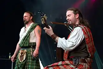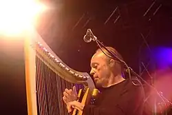Instruments associated with Celtic Music include the Celtic harp, uilleann pipes or Great Highland bagpipe, fiddle, tin whistle, flute, bodhrán, bones, concertina, accordion and a recent addition, the Irish bouzouki.[9] The mandolin has become increasingly common in Scottish folk ensembles during the 21st century, particularly within acoustic duos and contemporary folk groups drawing influence from both traditional dance tunes and modern Celtic arrangements.[10]