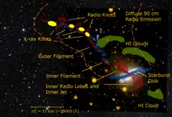The Einstein Observatory detected an X-ray jet emanating from the nucleus in 1979.[25] Ten years later, young blue stars were found along the central dust band with the Hubble Space Telescope.[26]