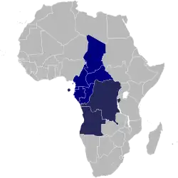 Central Africa (French: Afrique centrale; Spanish: África central; Portuguese: África Central) is a subregion of the African continent comprising various countries according to different definitions. Middle Africa is an analogous term used by the United Nations in its geoscheme for Africa and consists of the following countries: Angola, Cameroon, Central African Republic, Chad, Democratic Republic of the Congo, Republic of the Congo, Equatorial Guinea, Gabon, and São Tomé and Príncipe. The United Nations Office for Central Africa also includes Burundi and Rwanda in the region, which are considered part of East Africa in the geoscheme.[1] These eleven countries are members of the Economic Community of Central African States (ECCAS).[1] Six of those countries (Cameroon, Central African Republic, Chad, Equatorial Guinea, Gabon, and Republic of the Congo) are also members of the Economic and Monetary Community of Central Africa (CEMAC) and share a common currency, the Central African CFA franc.[2]