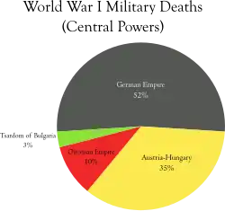 At the start of the war, the Central Powers consisted of the German Empire and the Austro-Hungarian Empire. The Ottoman Empire joined later in 1914, followed by the Tsardom of Bulgaria in 1915.[3]