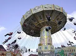 Riders on a swing carousel interpret the cessation of upward motion as a balancing of the force of gravity, the force of the tension of the chains, and a centrifugal force pushing them away from the center of rotation. A stationary observer on the ground observes uniform circular motion, which requires a net centripetal force that is the combination of the force of gravity and the force of the tension of the chains.