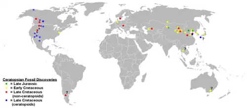 Ceratopsia appears to have originated in Asia, as all of the earliest members are found there. Fragmentary remains, including teeth, which appear to be neoceratopsian, are found in North America from the Albian stage (112 to 100 million years ago), indicating that the group had dispersed across what is now the Bering Strait by the middle of the Cretaceous Period.[24] Almost all leptoceratopsids are North American, aside from Udanoceratops, which may represent a separate dispersal event, back into Asia. Ceratopsids and their immediate ancestors, such as Zuniceratops, were unknown outside of western North America, and were presumed endemic to that continent.[4][25] The genera Ajkaceratops and Ferenceratops are known from Hungary and Romania, more specifically the Santonian-aged Csehbánya Formation in Hungary and the Maastrichtian-aged Sânpetru and Densuş-Ciula formations in Romania respectively. This suggests that ceratopsians managed to reach Europe in the late Cretaceous via island-hopping, perhaps from Asia.