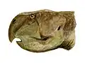 Ceratopsians are easily recognized by features of the skull. On the tip of a ceratopsian upper jaw is the rostral bone, an edentulous (toothless) ossification, unique to ceratopsians. Othniel Charles Marsh recognized and named this bone, which acts as a mirror image of the predentary bone on the lower jaw. This ossification evolved to morphologically aid the chewing of plant matter.[3] Along with the predentary bone, which forms the tip of the lower jaw in all ornithischians, the rostral forms a superficially parrot-like beak. Also, the jugal bones below the eye are prominent, flaring out sideways to make the skull appear somewhat triangular when viewed from above. This triangular appearance is accentuated in later ceratopsians by the rearwards extension of the parietal and squamosal bones of the skull roof, to form the neck frill.[4][5]