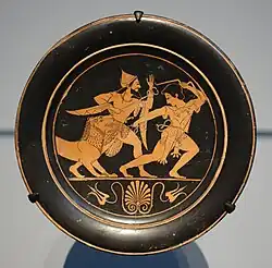 The earliest evidence for the involvement of Theseus and Pirithous in the Cerberus story, is found on a shield-band relief (c. 560 BC) from Olympia, where Theseus and Pirithous (named) are seated together on a chair, arms held out in supplication, while Heracles approaches, about to draw his sword.[50] The earliest literary mention of the rescue occurs in Euripides, where Heracles saves Theseus (with no mention of Pirithous).[51] In the lost play Pirithous, both heroes are rescued,[52] while in the rationalized account of Philochorus, Heracles was able to rescue Theseus, but not Pirithous.[53] In one place Diodorus says Heracles brought back both Theseus and Pirithous, by the favor of Persephone,[54] while in another he says that Pirithous remained in Hades, or according to "some writers of myth" that neither Theseus, nor Pirithous returned.[55] Both are rescued in the Fabulae of Hyginus.[56] Finally, there is a version where Cerberus eats Pirithous.[57]