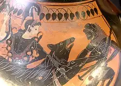 In Greek art, the vast majority of depictions of Heracles and Cerberus occur on Attic vases.[129] Although the lost Corinthian cup shows Cerberus with a single dog head, and the relief pithos fragment (c. 590–570 BC) apparently shows a single lion-headed Cerberus, in Attic vase painting Cerberus usually has two dog heads.[130] In other art, as in the Laconian cup, Cerberus is usually three-headed.[131] Occasionally in Roman art Cerberus is shown with a large central lion head and two smaller dog heads on either side.[132]