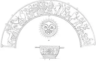 The capture of Cerberus was a popular theme in ancient Greek and Roman art.[125] The earliest depictions date from the beginning of the sixth century BC. One of the two earliest depictions, a Corinthian cup (c. 590–580 BC) from Argos (now lost),[126] shows a naked Heracles, with quiver on his back and bow in his right hand, striding left, accompanied by Hermes. Heracles threatens Hades with a stone, who flees left, while a goddess, perhaps Persephone or possibly Athena, standing in front of Hades' throne, prevents the attack. Cerberus, with a single canine head and snakes rising from his head and body, flees right. On the far right a column indicates the entrance to Hades' palace. Many of the elements of this scene—Hermes, Athena, Hades, Persephone, and a column or portico—are common occurrences in later works. The other earliest depiction, a relief pithos fragment from Crete (c. 590–570 BC), is thought to show a single lion-headed Cerberus with a snake (open-mouthed) over his back being led to the right.[127]