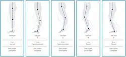 Classification of the gait pattern according to the Amsterdam Gait Classification: In gait type 1, the knee angle is normal and the foot contact is complete. In gait type 2, the knee angle is hyperextended and the foot contact is complete. In gait type 3, the knee angle is hyperextended and foot contact is incomplete (only on the forefoot). In gait type 4, the knee angle is bent and foot contact is incomplete (only on the forefoot). With gait type 5, the knee angle is bent and the foot contact is complete.[128]