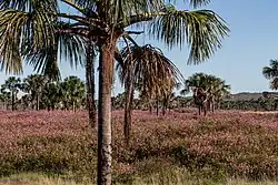Probably around 800 species of trees are found in the Cerrado.[5] Among the most diverse families of trees in the Cerrado are the Leguminosae (153 spp.), Malpighiaceae (46), Myrtaceae (43), Melastomataceae (32), and Rubiaceae (30).[8] Much of the Cerrado is dominated by the Vochysiaceae (23 species in the Cerrado) due to the abundance of three species in the genus Qualea.[5] The herbaceous layer usually reaches about 60 cm in height and is composed mainly of the Poaceae, Cyperaceae, Leguminosae, Compositae, Myrtaceae and Rubiaceae.[5] Much of the vegetation in the gallery forests is similar to nearby rainforest; however, there are some endemic species found only in the Cerrado gallery forests.[5]