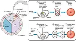 Over 200 types of HPV known,[56] 12 are classified as high-risk types (16, 18, 31, 33, 35, 39, 45, 51, 52, 56, 58, and 59),[56] three as probable high-risk (26, 53, and 66), and 12 as low-risk (6, 11, 40, 42, 43, 44, 54, 61, 70, 72, 81, and CP6108).[57] Most cases of squamous cell carcinomas of the cervix are due to HPV type 16 and most cases of adenocarcinoma are due to HPV type 18.[22] High risk HPV viral subtypes can integrate their DNA into the host genome and induce transcription of the viral cancer causing proteins E6 and E7.[22][58] E6 degrades the tumor suppressing protein p53 and E7 degrades and inactivates the tumor suppressing protein pRb. The loss of p53 and pRb leads to increased blood vessel growth feeding tumors (via vascular endothelial growth factor (VEGF) over-expression), loss of tumor cell suppression and cell cycle regulation disruptions, all of which can lead to cervical cancer.[22]