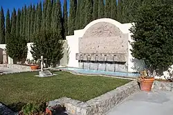 The union purchased land known as The Forty Acres for their new headquarters.[141] Chavez hoped for it to be a "spiritual" center where union members would relax; he designed it to have a swimming pool, a chapel, a market, and a gas station, as well as gardens with outdoor sculptures.[145] He wanted the main building to be decorated inside with Gandhi quotations in English and Spanish.[145] Meanwhile, Chavez was increasingly concerned that his supporters might turn to violence.[146] Members had engaged in the destruction of property, something they regarded as not breaching the movement's ethos on non-violence.[147] Chavez's cousin Manuel had tampered with refrigerator units on trains, so that grapes being shipped out of Delano spoiled before reaching their destination;[147] Chavez noted that "He's done all the dirty work for the union. There's a lot of fucking dirty work, and he did it all."[147] In February 1968, the Giumarra company obtained a contempt citation against the union, claiming that its members had used threatening and intimidating behavior against its employees and had placed roofing nails at the entrances to its ranches.[148]